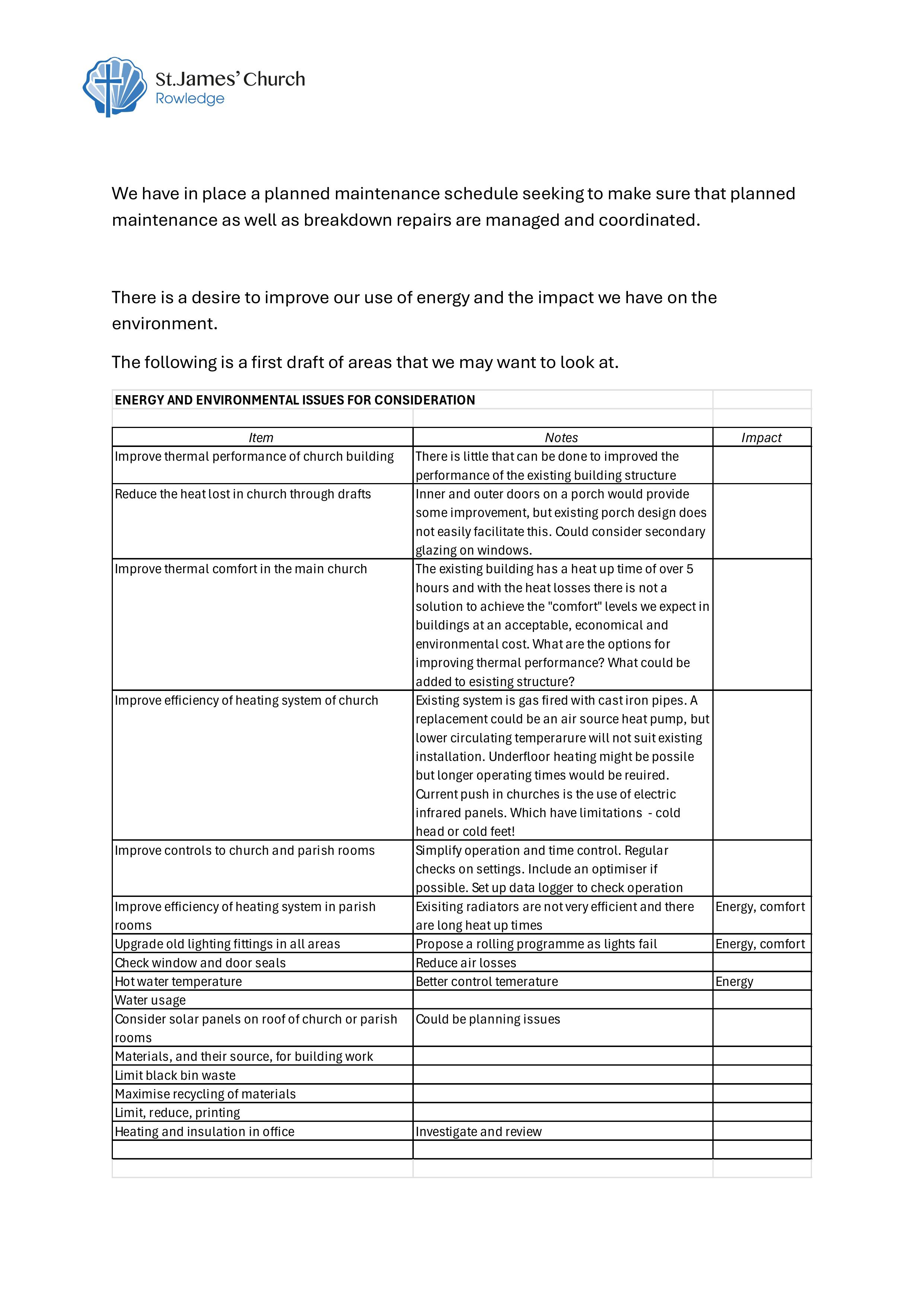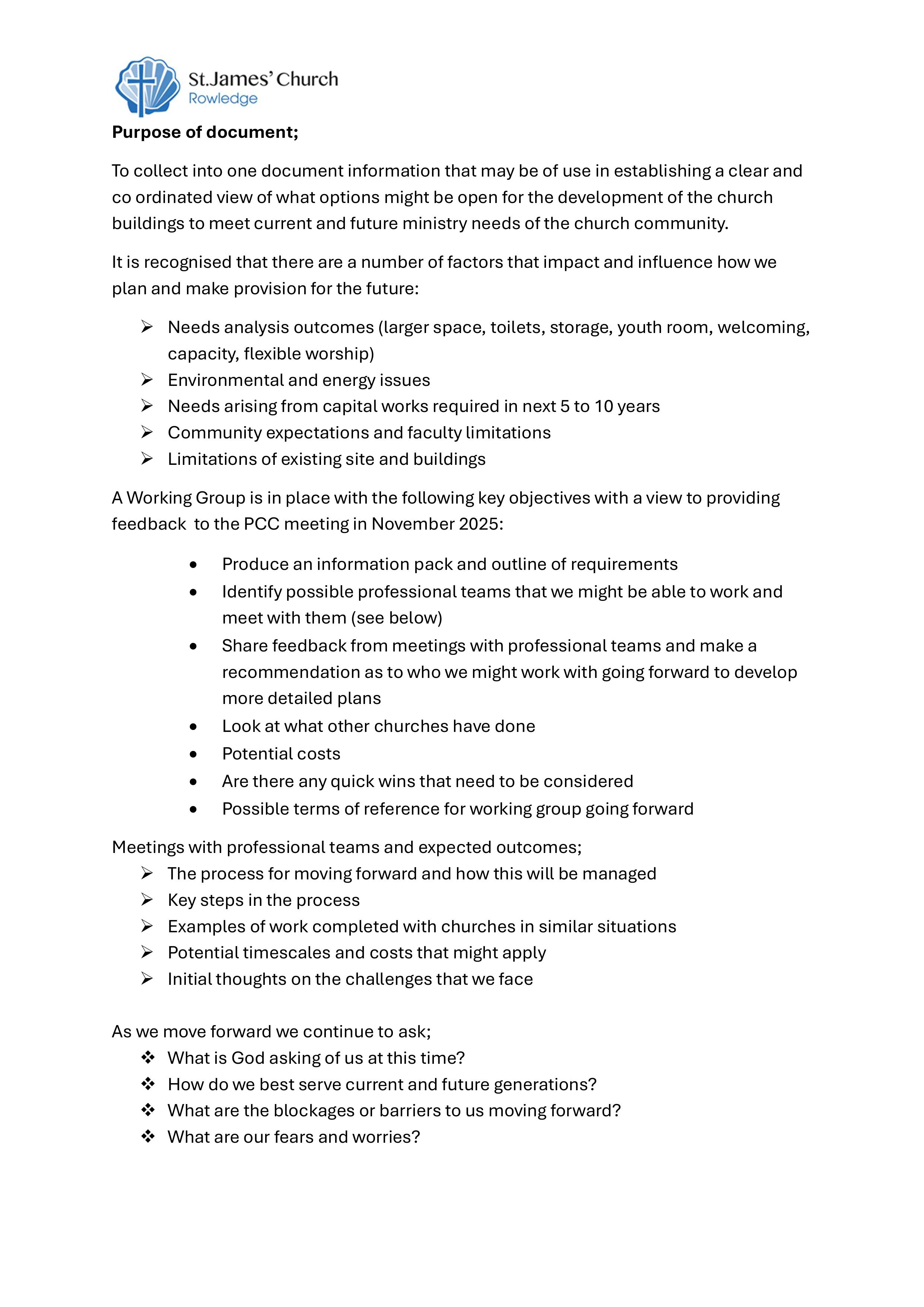 This is the “Moving Forward” that captures information about our buildings; including current use, possible future requirements, and our mission as well as environmental and capital challenges. It provides a base of information for the feasibility study.